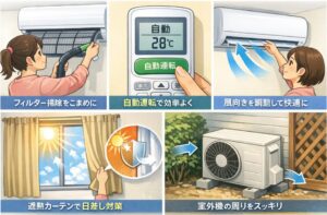 また、冷房は除湿や風向き調整で体感を変えられる場合があります。温度だけで解決しようとすると負荷が上がりやすいので、体感の調整を組み合わせると消費電力の増え方を抑えやすくなります。