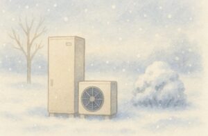 エコキュートはヒートポンプで外気の熱を集め、冷媒を圧縮して高温化し、その熱で貯湯タンクの水を温めます。外気温が低い冬は取り込める熱エネルギーが減り、同じ湯温まで上げるのに多くの電力が必要になります。