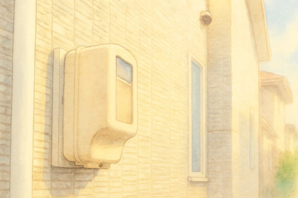 配線管やブレーカーボックスが近くにある場合、その周辺に電力量計が設けられていることが一般的です。ガスメーターと並んでいる例も多いため、丸形のガスメーターと四角い電力量計の並びを探すと手掛かりになります。